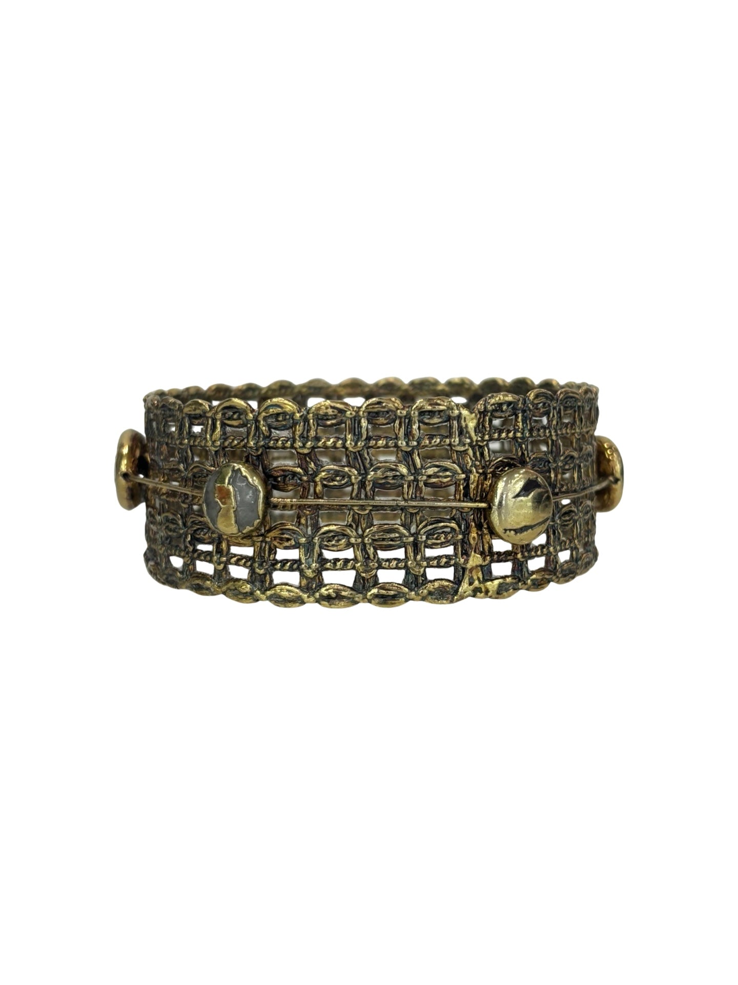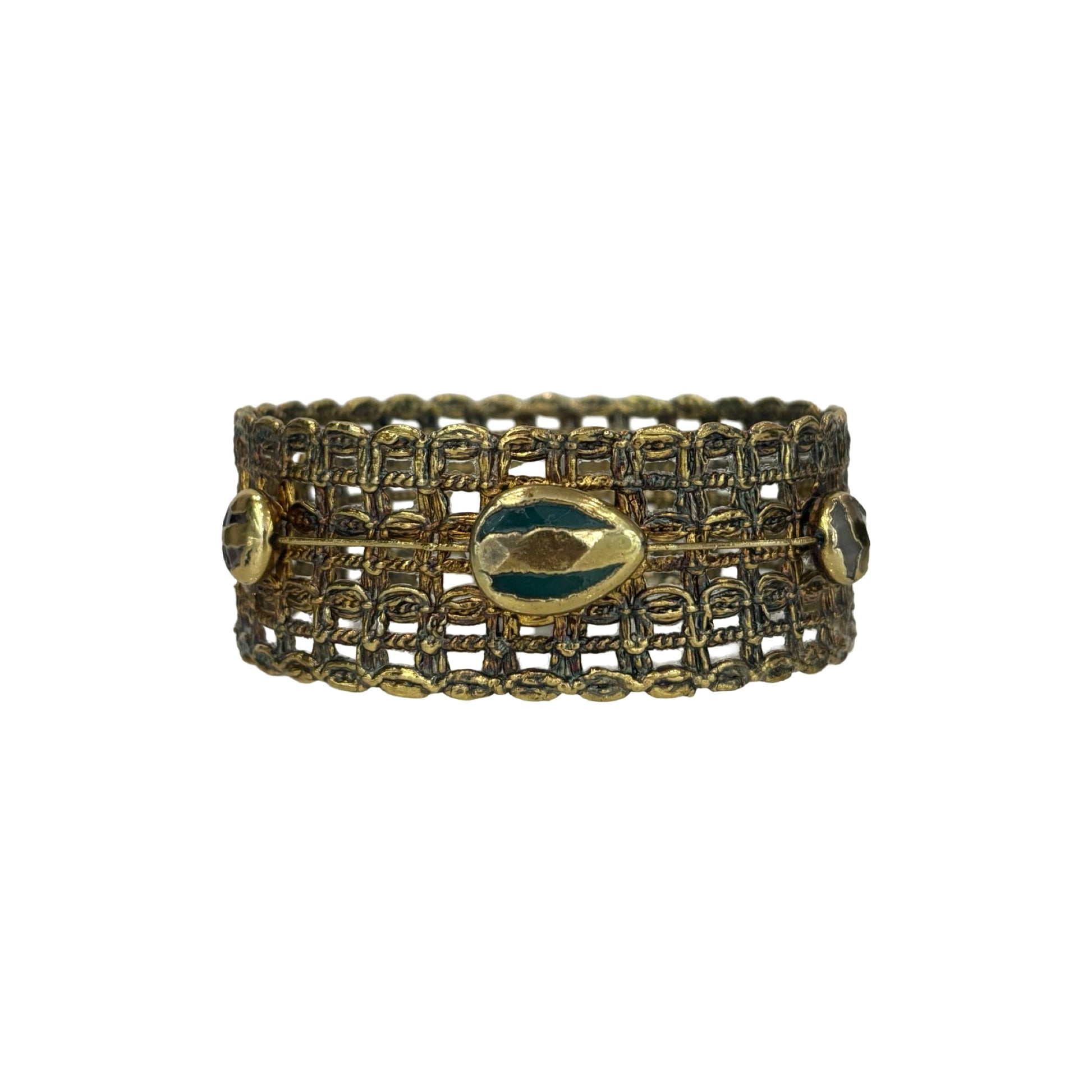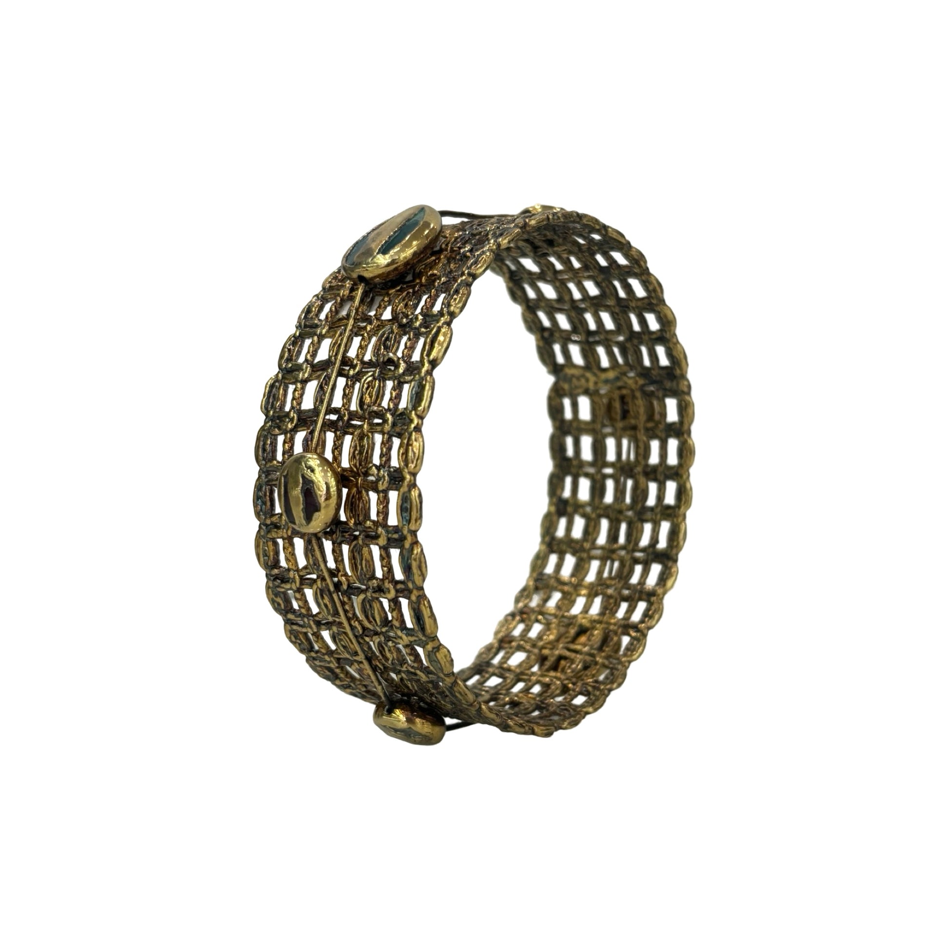 Questo bracciale da avambraccio, realizzato in bronzo e impreziosito da pietre dure naturali, è un’opera d’arte contemporanea. Le pietre, collegate tra loro da sottili fili di bronzo, creano un effetto visivo che richiama una trama raffinata e sofisticata. Alcune pietre presentano decorazioni in bronzo, quasi come se fossero state delicatamente bagnate nel metallo, donando al bracciale un aspetto organico e artistico. Perfetto per chi cerca un gioiello dal design esclusivo, capace di raccontare una storia di artigianato e bellezza.