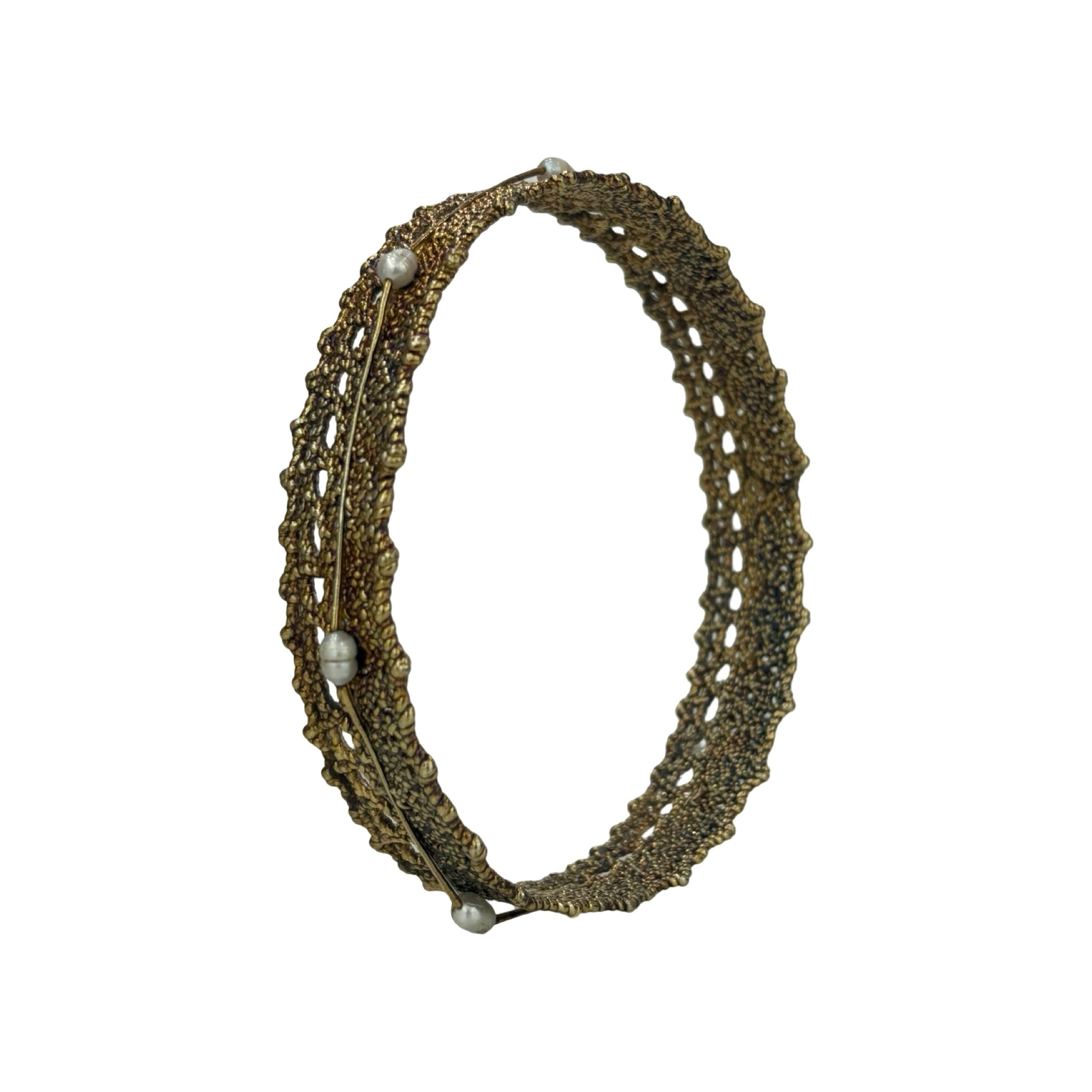 Questo bracciale da avambraccio in filigrana dorata celebra l’eleganza senza tempo con una lavorazione che richiama la delicatezza dei merletti antichi. Le perle aggiungono un tocco luminoso e discreto, ideale per la donna cosmopolita e sofisticata. Un gioiello pensato per completare con stile sia i look quotidiani che le occasioni speciali.