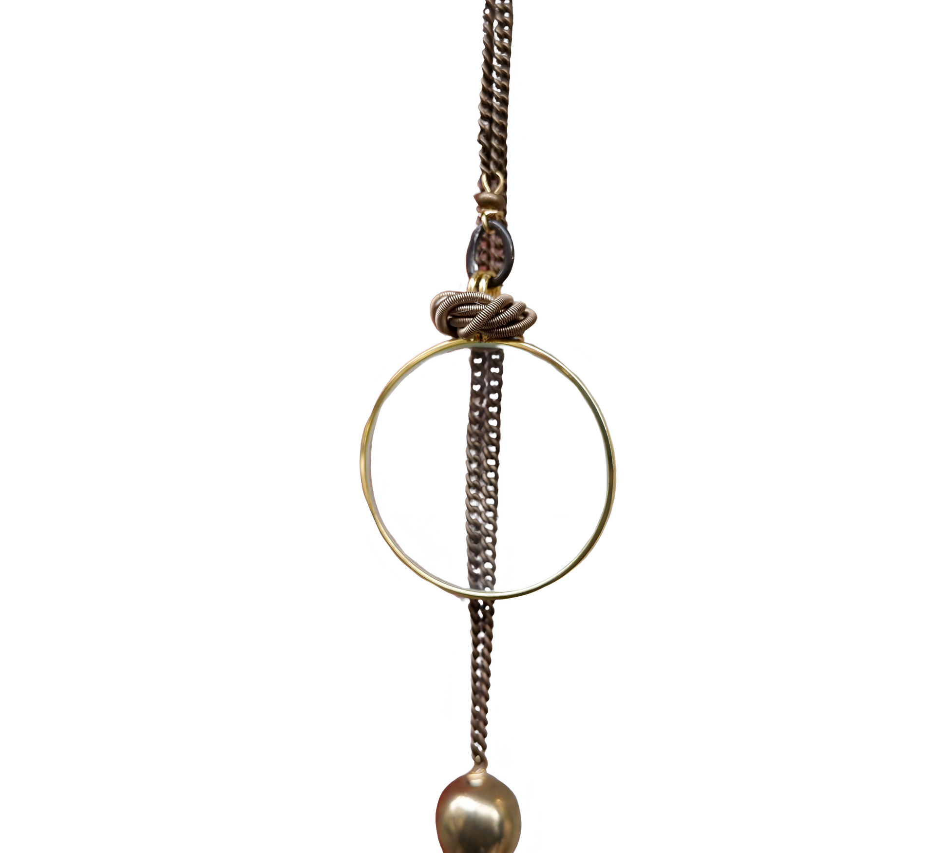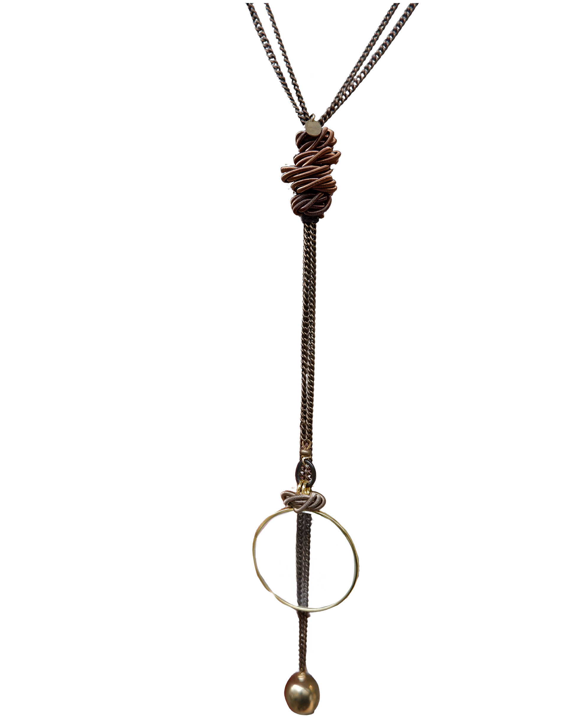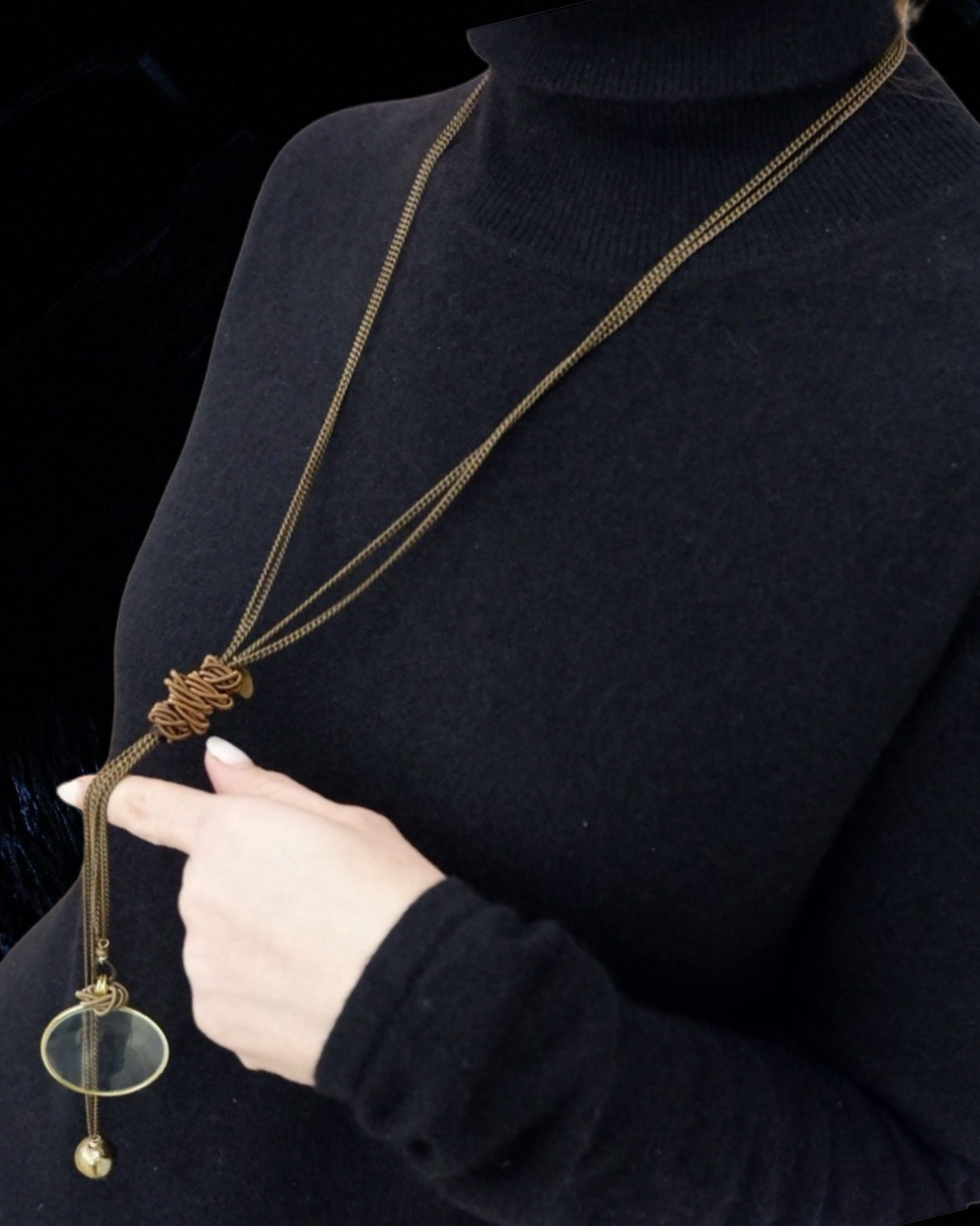 Collana in acciaio brunito che gioca sugli equilibri dei pendenti e degli intrecci per concludersi con una lente gioiello.