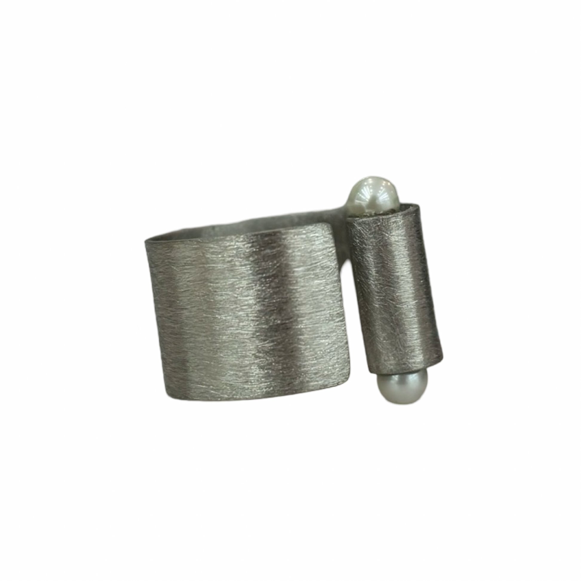 Anello a fascia di ispirazione ai gioielli dell’antica Roma, anello pulito ma di grande effetto e presenza, la linea è arricchita da 2 perle di fiume piccole, molto elegante.