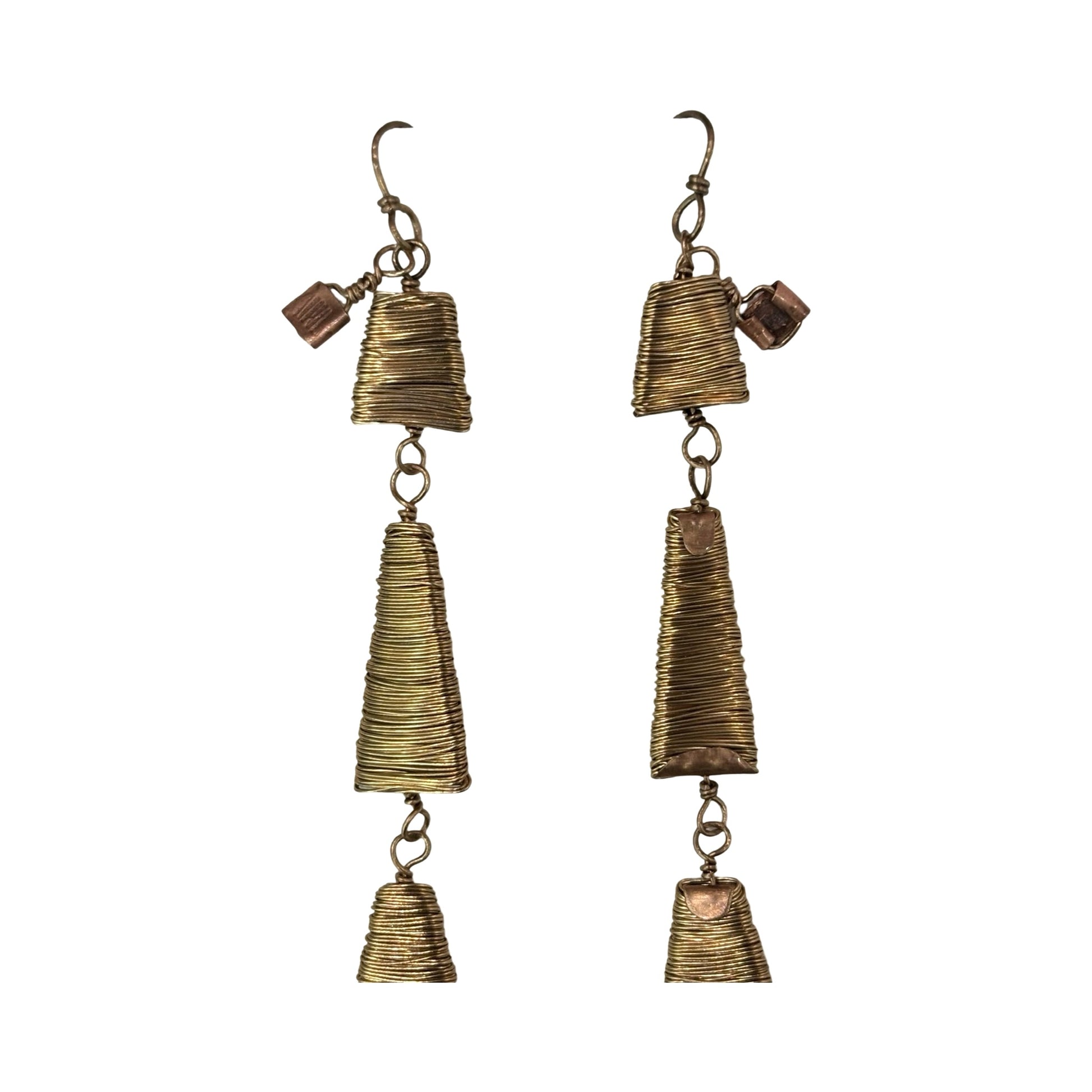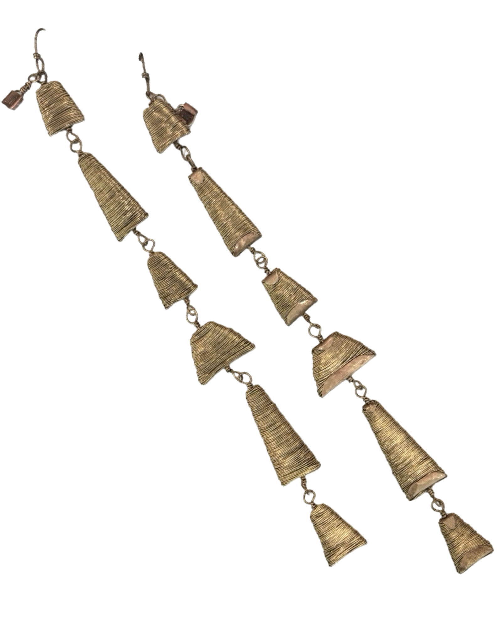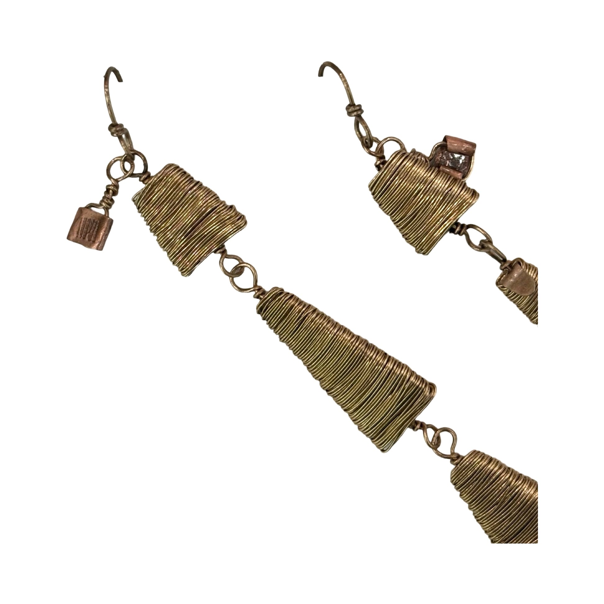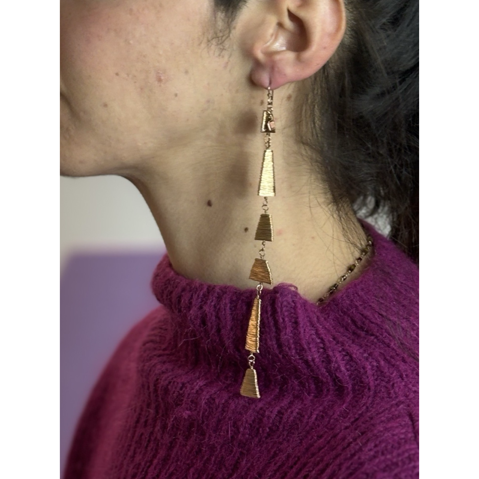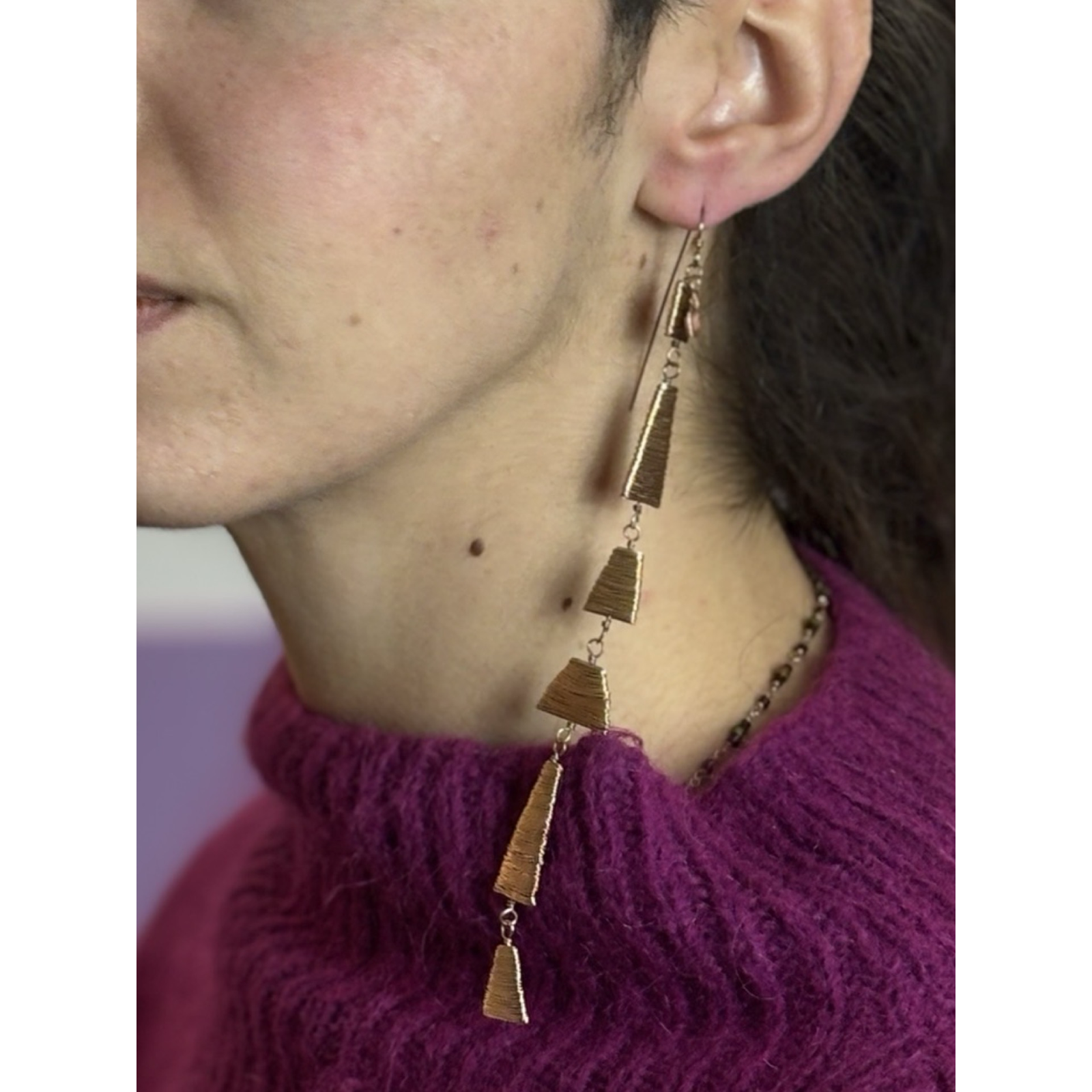 Orecchini in bronzo e rame che riproducono il movimento delle onde sonore.