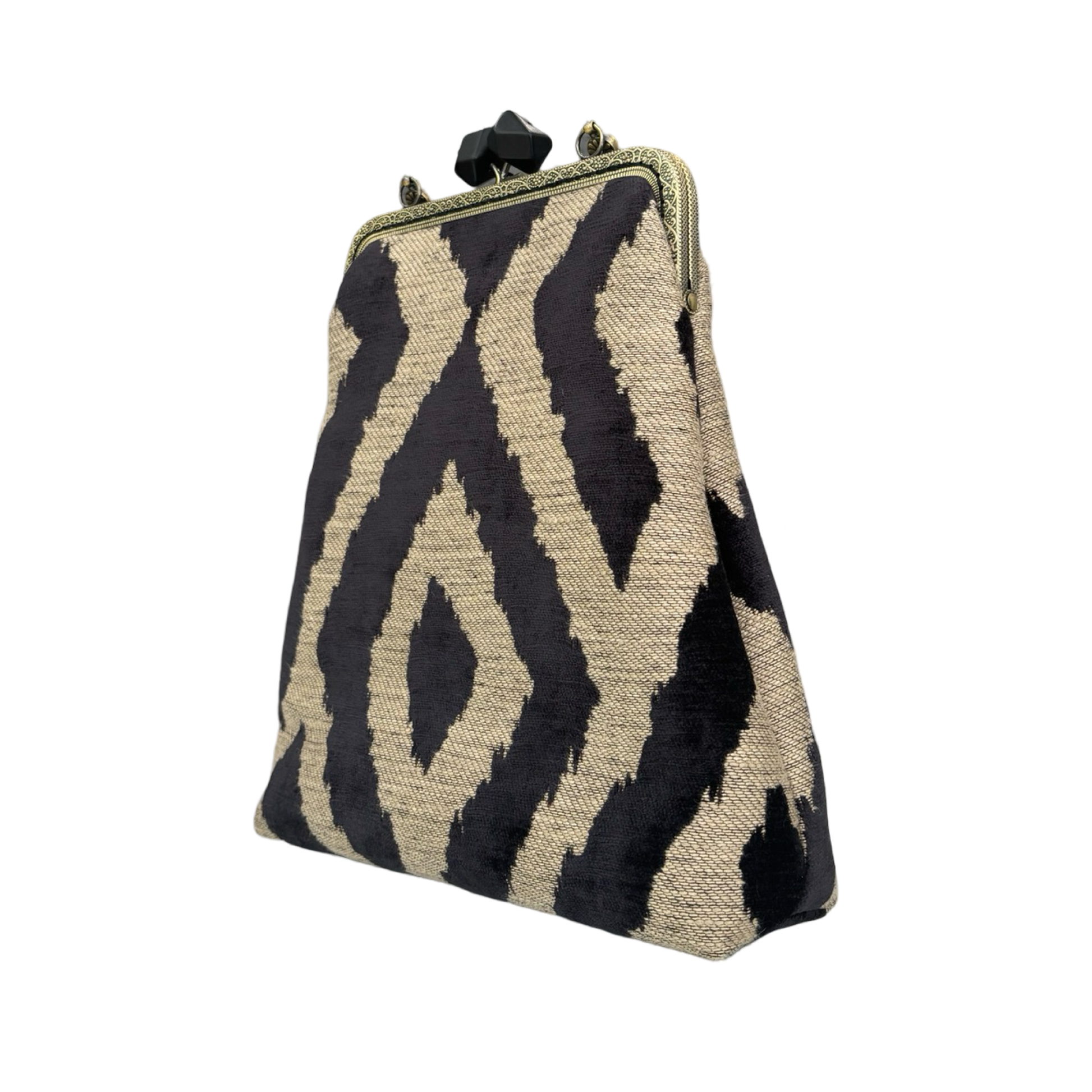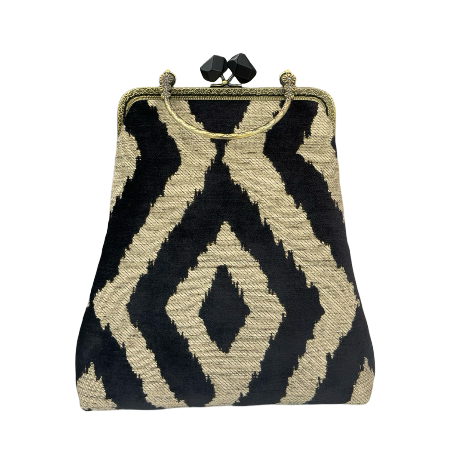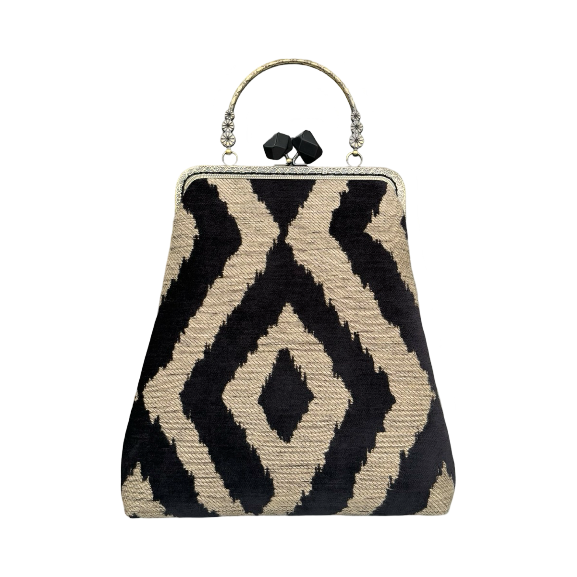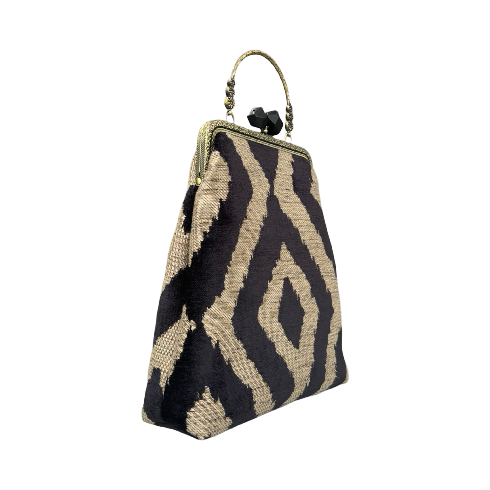 - Chiusura: A borsellino con telaio in ottone e pomelli sfaccettati in resina