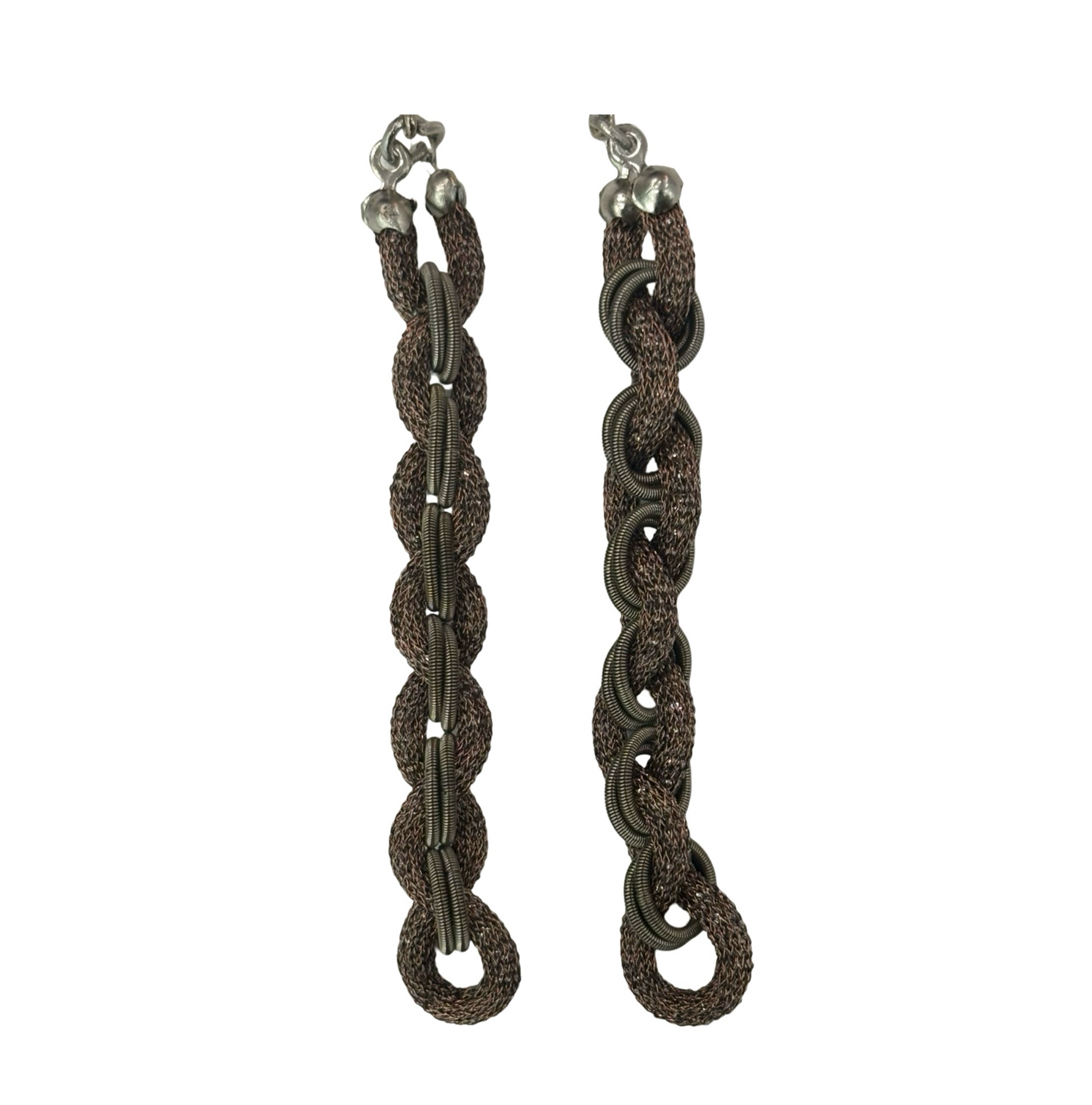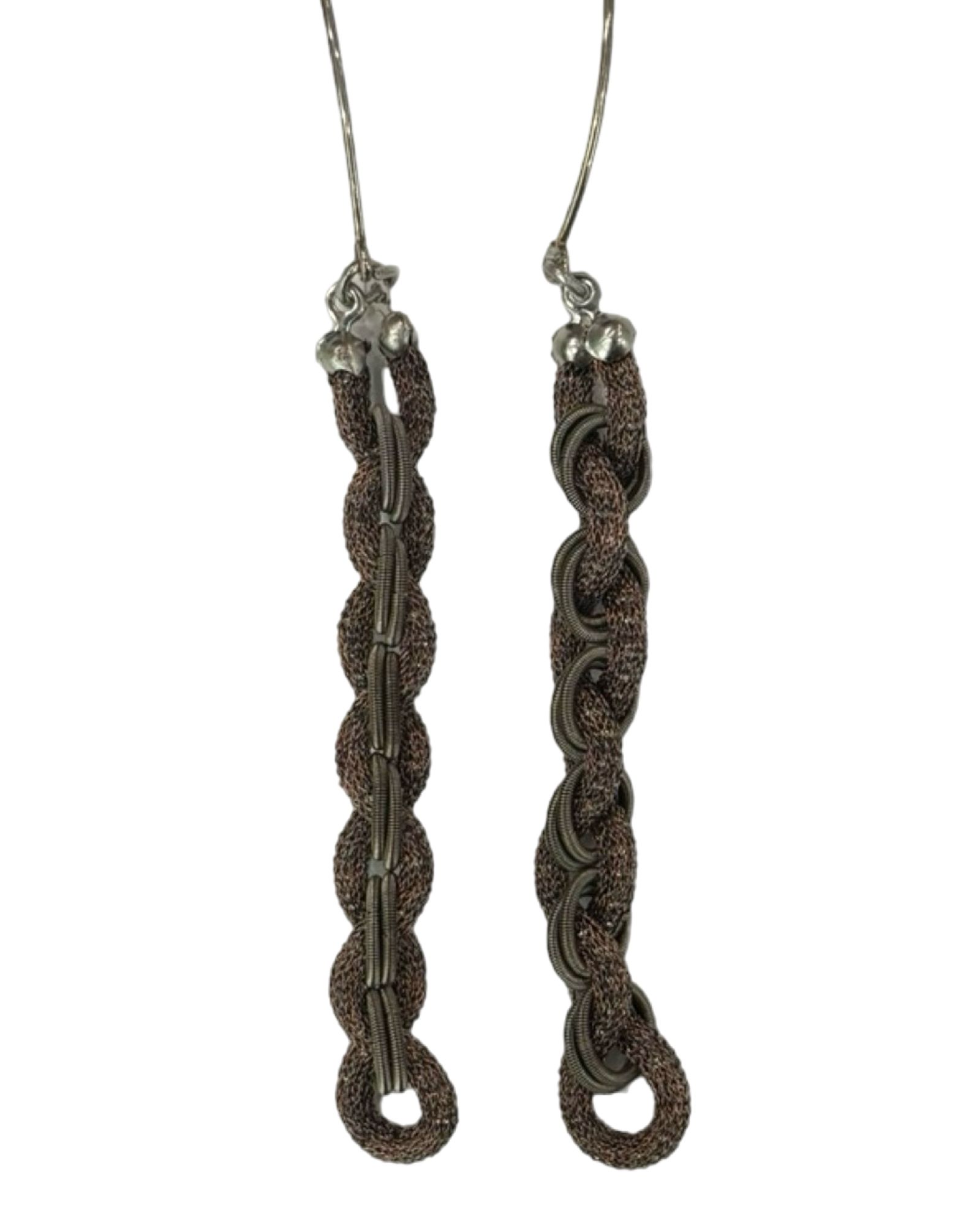 Orecchini intrecciati in tessuto e metallo con perno in argento.