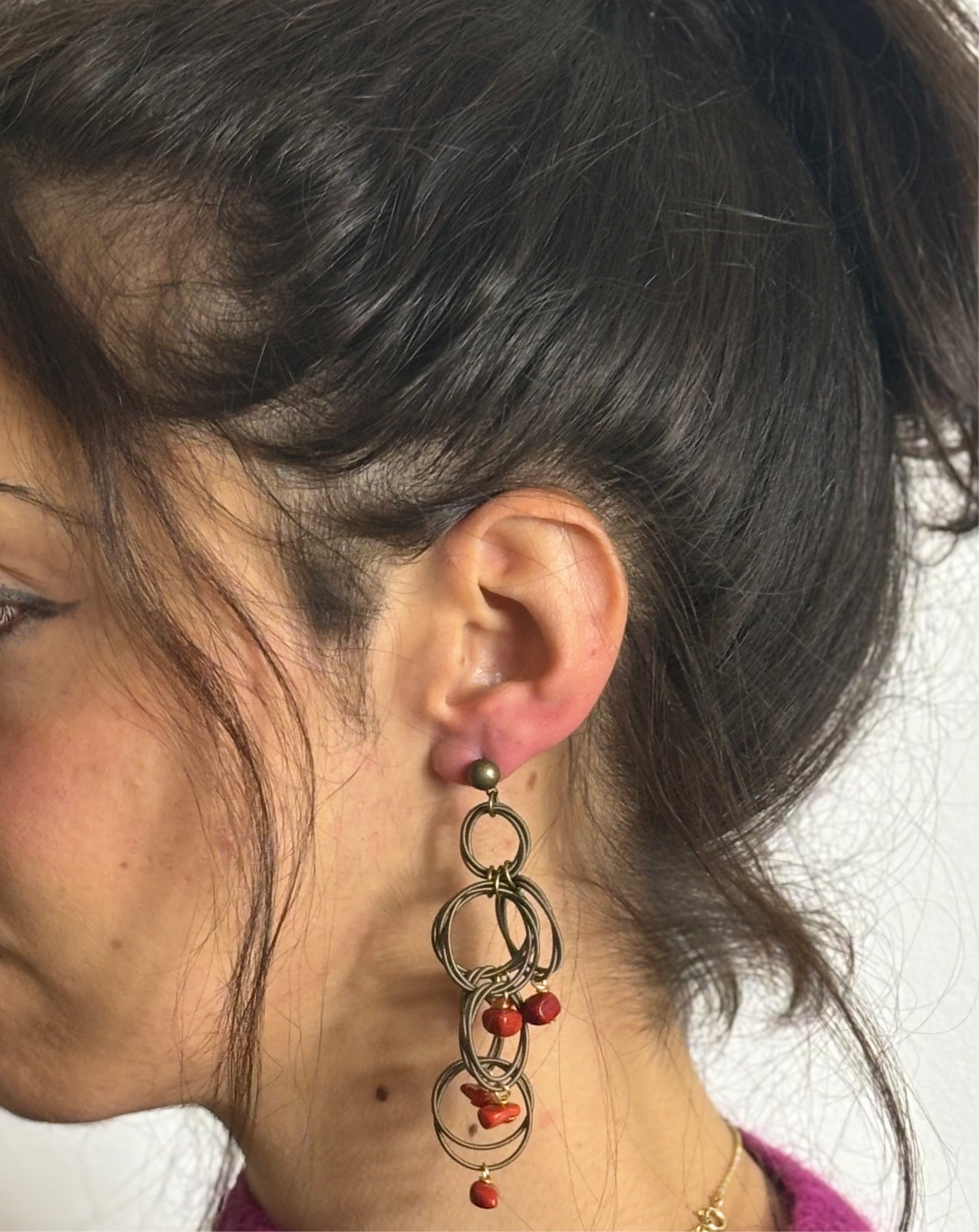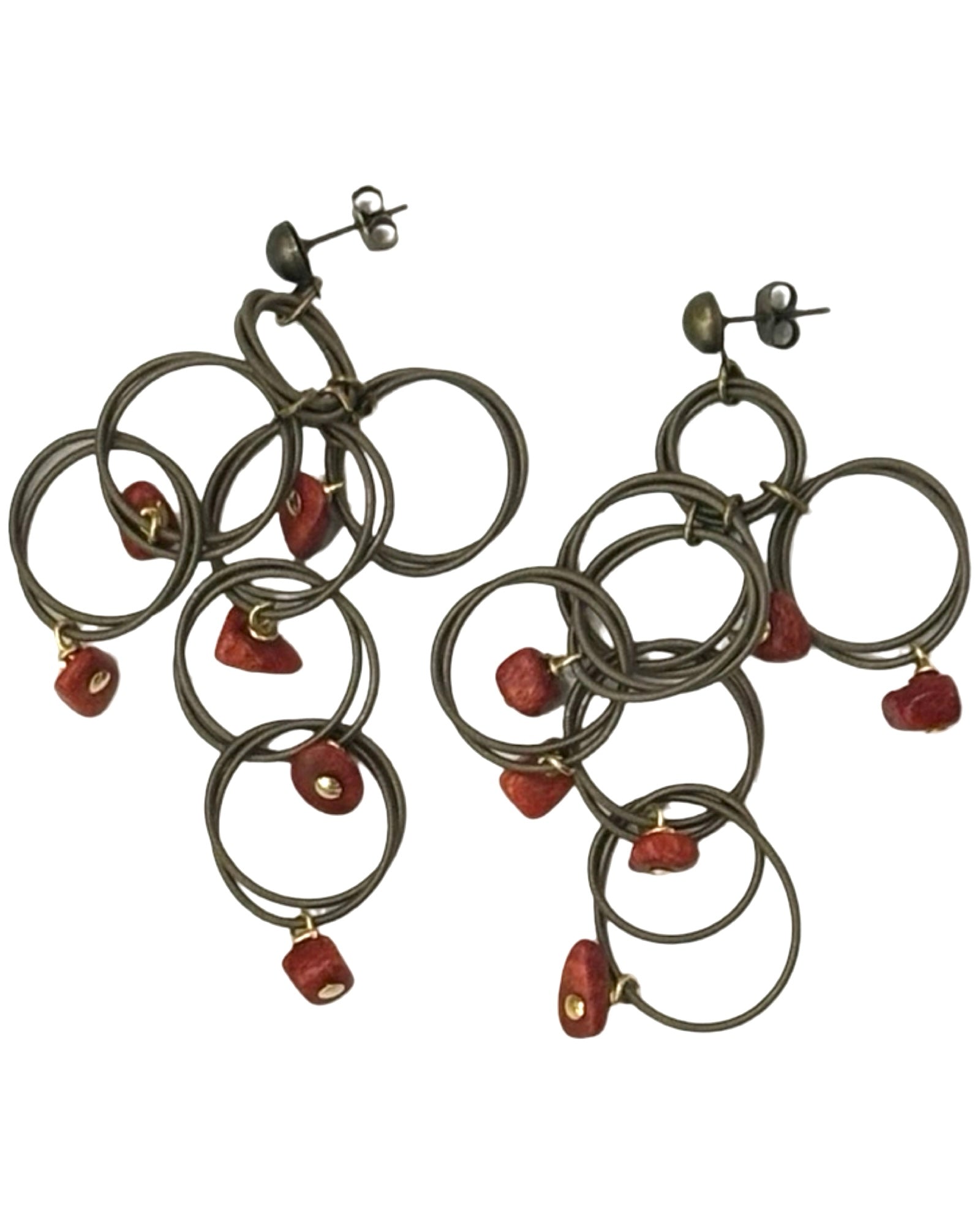 Orecchini in acciaio brunito con piccoli coralli.